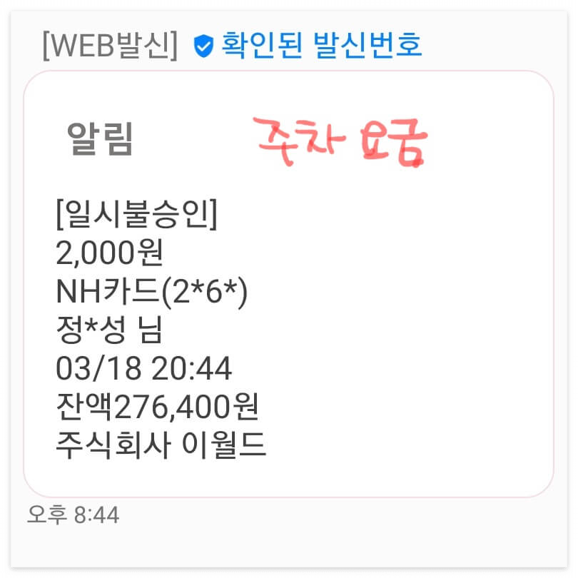- 집에 올 때 주차 정산까지 문화누리카드로 계산 완료!(이월드 연간회원 주차요금은 시간 상관없이 1일 2,000원입니다)