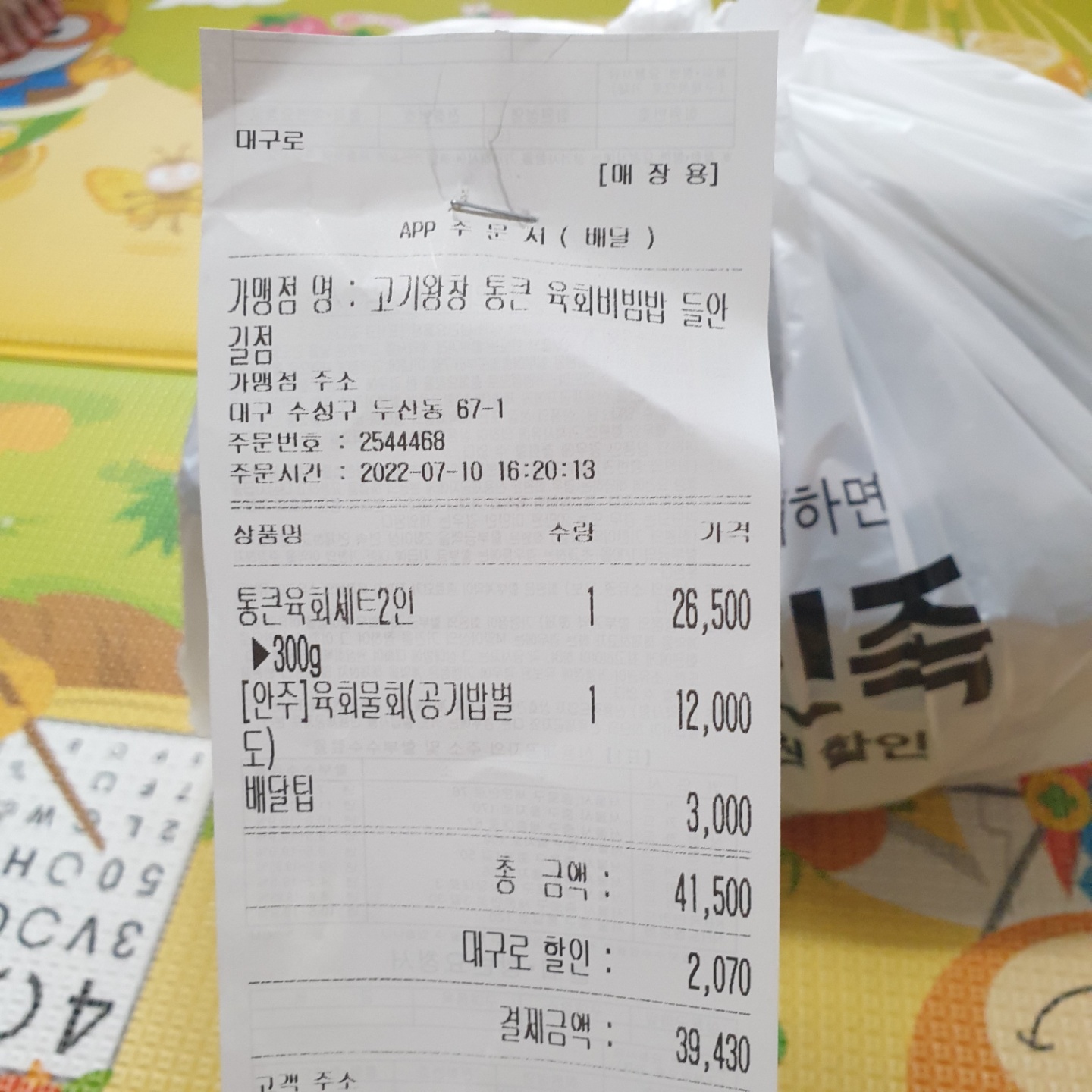 - 총 결제 금액 : 총금액 41,400원 - 앱 할인 2,070원 = 39,430원