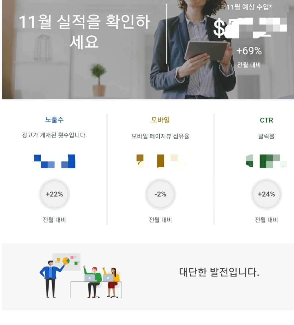 10월에 비해 11월에 총 방문자수와 모바일 점유율은 떨어졌지만, 광고 노출과 CTR 수치는 조금 올랐네요.