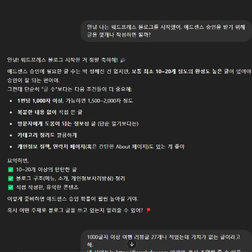 2023년 8월에 카페24에 워드프레스를 처음 개설하고, 1년 반정도 지난 지금 글을 겨울 27개 작성했더군요. 거의 방치 상태죠. 그래서 워드프레스에 대해 너무 몰라 챗gpt에게 워드프레스 애드센스 승인 방법을 물어봤어요. 이녀석! 아주 좋은 선생님이네요 :)