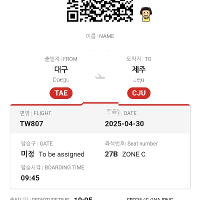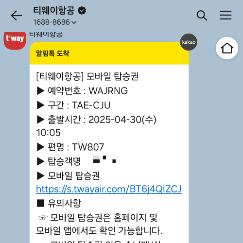 티웨이 항공에서 출발 하루 전 오는 카카오톡 링크 중 모바일 탑승권 링크를 통해 미리 기본 정보를 입력하면, 다음번 링크 클릭시 정보 재입력 없이 바로 QR 코드를 확인 할 수있어요!