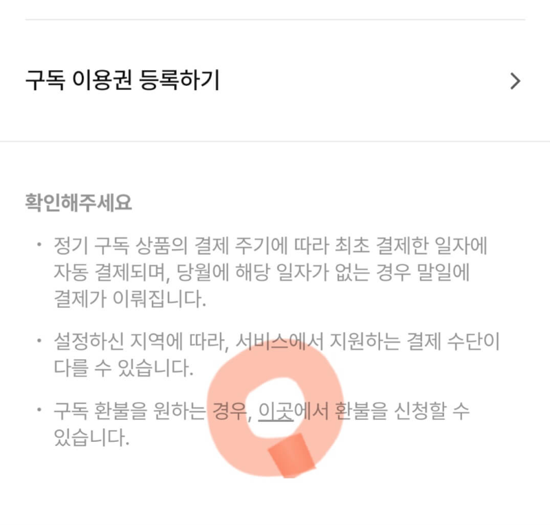 - 스크롤을 제일 아래로 내리면 작은 글자로 구독 환불을 원하는 경우 '이곳'에서 환불 신청할 수 있다는 글자가 보입니다