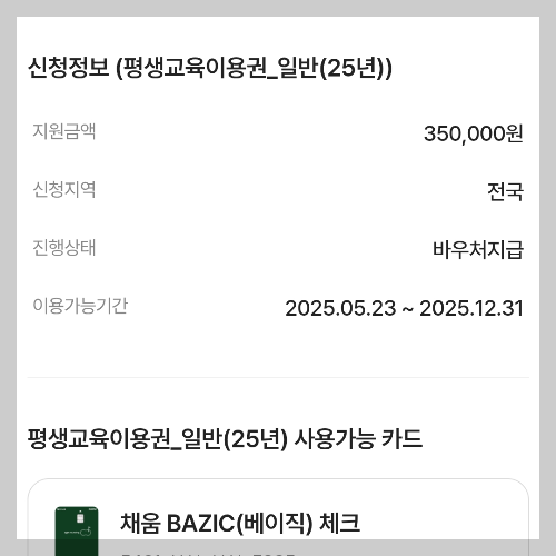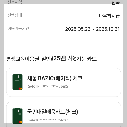 작년까지는 별도의 평생교육바우처 전용 카드가 발급되어 바우처 포인트를 충전해 사용하셨을 텐데요, 2025년부터는 기존 바우처 카드는 더 이상 사용할 수 없습니다.